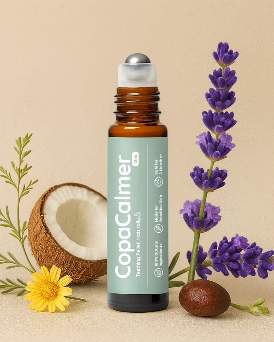 Unlike teething gels or toys with fillers and artificial ingredients, CopaCalmer™ keeps it pure and simple — made with a carefully balanced blend of 100% natural, baby-safe essential oils that work together to calm nerves, ease inflammation, and restore peace.