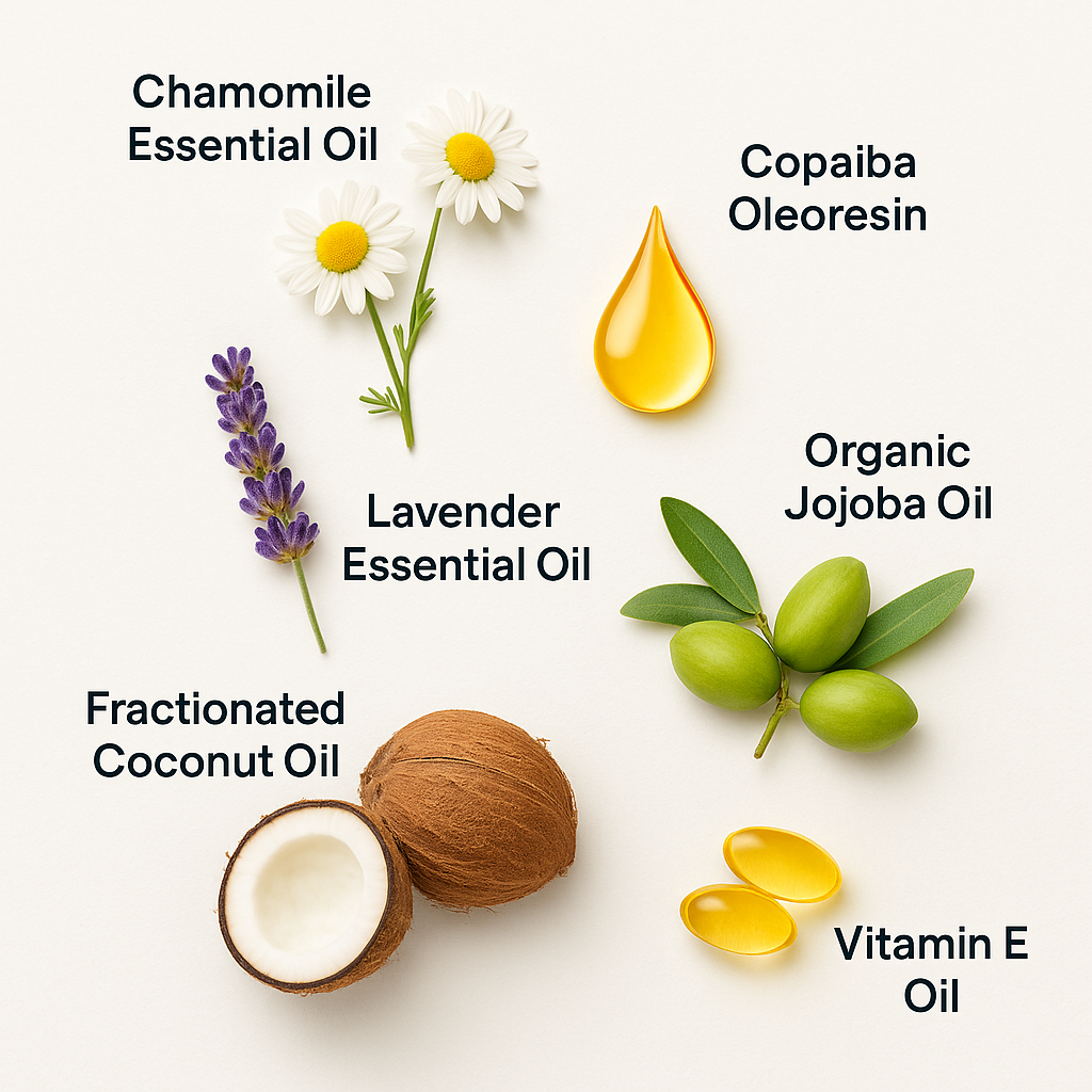 Fractionated Coconut Oil, Organic Jojoba Oil, Chamomile Essential Oil, Lavender Essential Oil, Copaiba Oleoresin, Frankincense Essential Oil, and Vitamin E Oil.